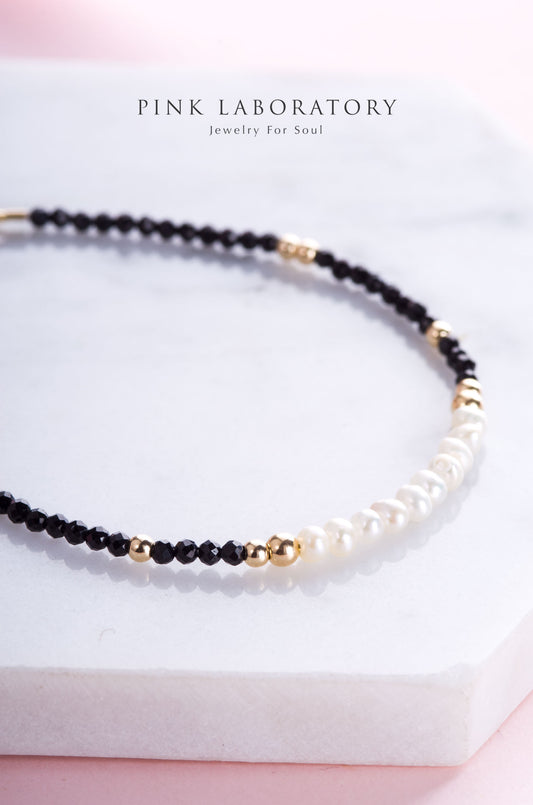天然淡水珍珠手鍊 | 黑尖晶石 | 14K包金