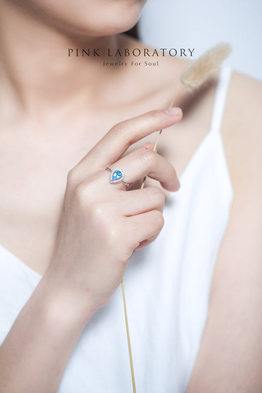倫敦藍拓帕石花邊戒指 | 925純銀鍍白金